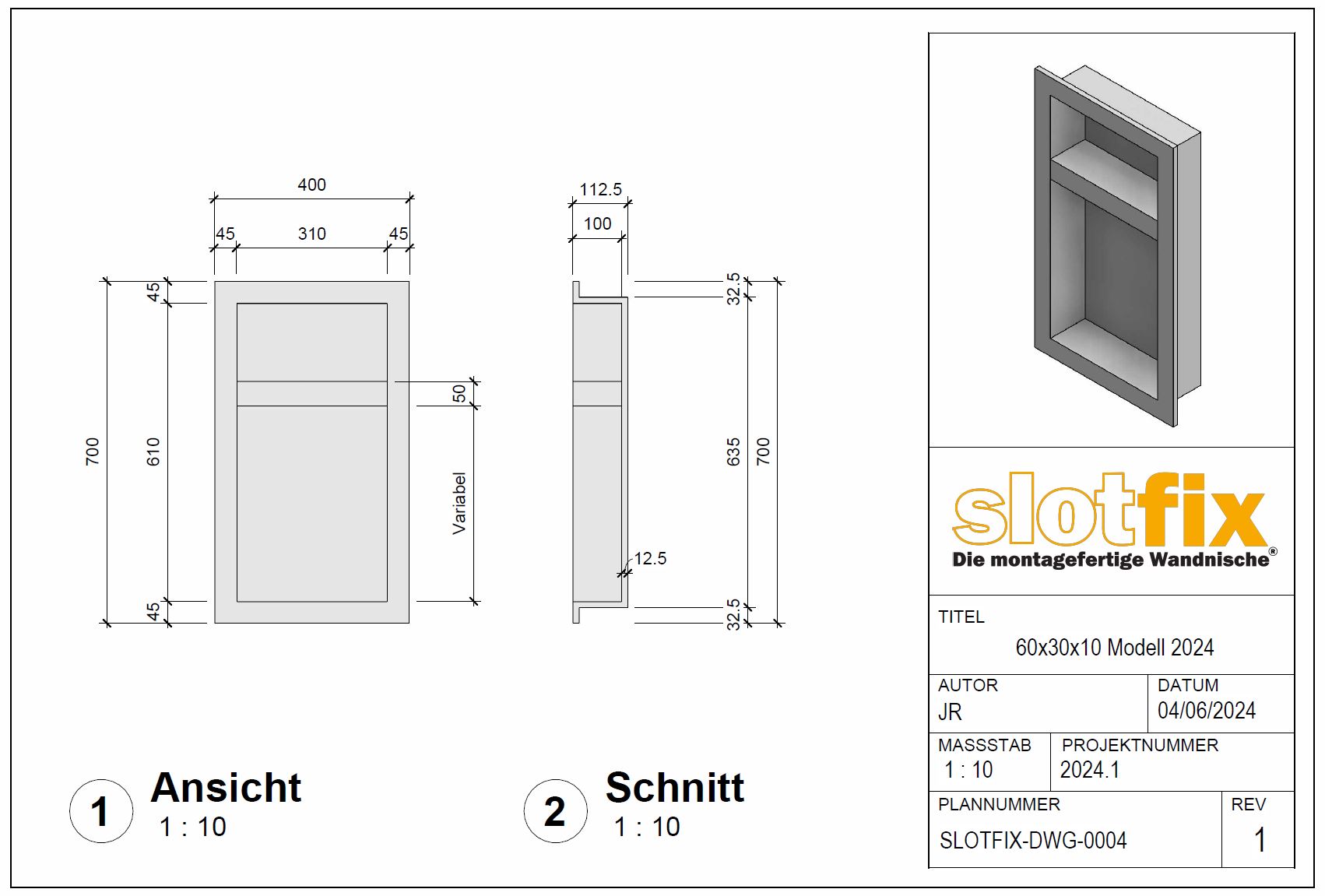 1x Slotfix Wandnische, Innenmaße: 610 × 310 × 100 mm , Plattendicke: 12,5mm